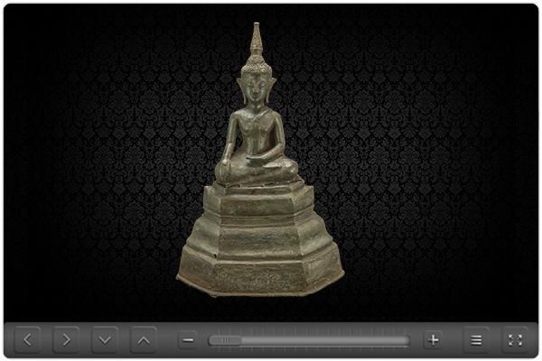 - Buddha image Subduing Mara sat cross-legged on the flat base. Eyebrows arched and curved flat. Eyes glanced low. Nose is a prominent ridge, thin lips. Knot on the Buddha image's head spike. Halo is a lotus bud, had hair streak. His robe clad oblique.